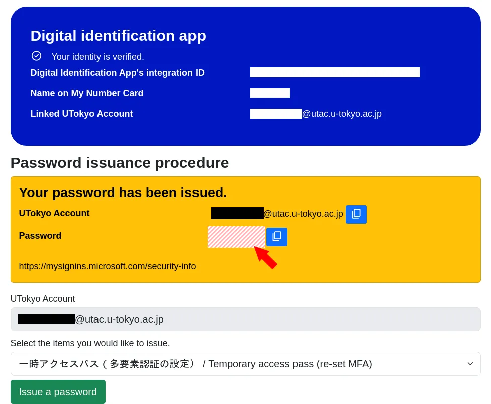 5. A “Your password has been issued” message will appear. Copy the temporary password provided, then access a page that requires UTokyo Account authentication (e.g., Security info page).