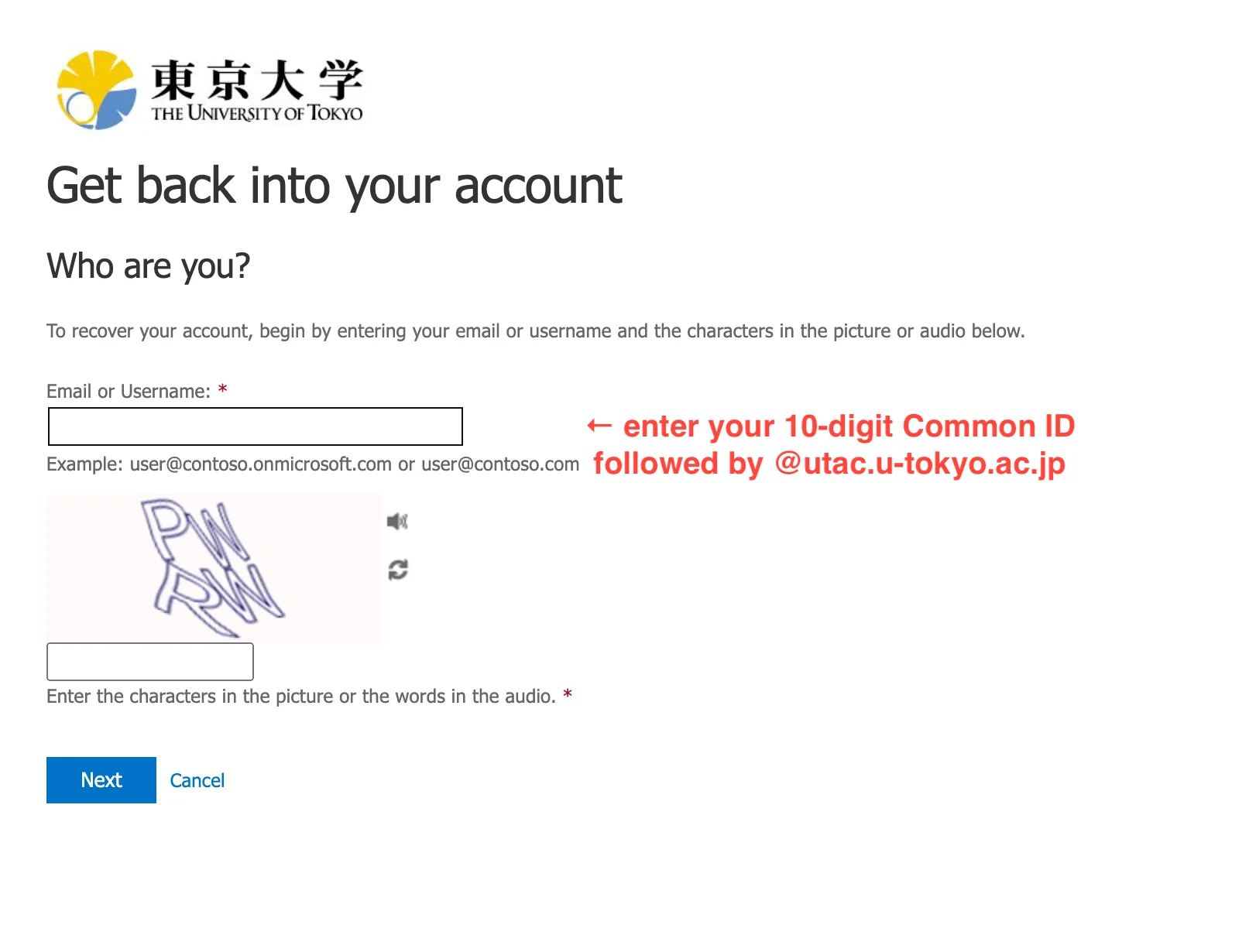 2. The following “Get back into your account” will appear. Enter “10-digit Common ID + @utac.u-tokyo.ac.jp” in the “Email or Username” field, and the text in the image below it, then press “Next”.