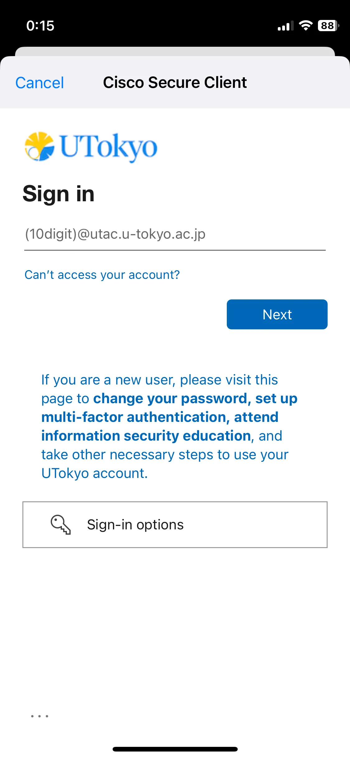 Troubleshooting guide: When the error message “申し訳ありませんが、サインイン中に問題が発生しました” or “Sorry, but we’re having trouble signing you in.” appears There is a possibility that you have not passed the information security education confirmation test, which is required to use UTokyo VPN. Please check the page for the Information Security Education, and complete and pass the confirmation test. Once you pass the test, the results will be immediately reflected in the system.