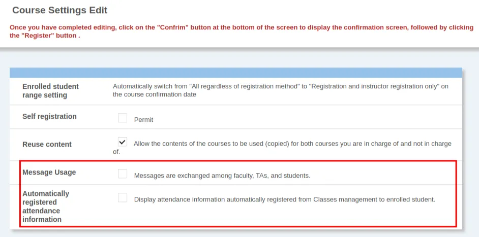 The Enrolled student range settings automatically switch from All regardless of registration method to Registration and instructor registration only on the course confirmation date. However, in courses that the course instructor has applied for creation, the Enrolled student range setting is always fixed to Always “All regardless of registration method”.