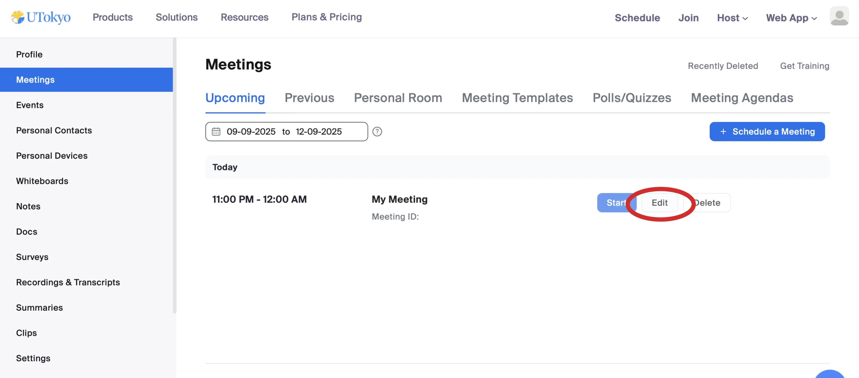 • Hover over the meeting you want to operate on, and click the Edit button that appears. This opens the Edit “My Meeting(This is where the name of the meeting you scheduled will be inserted)” screen.